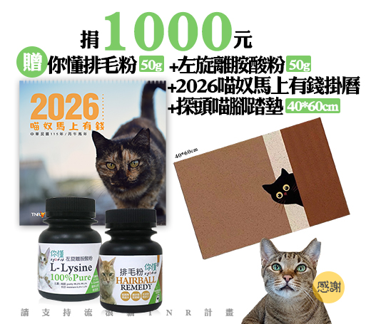 候補人員: 說明: 捐1000元贈你懂排毛粉(50g)+左旋離胺酸粉(50g)+2026喵奴馬上有錢掛曆+探頭喵腳踏墊(40*60cm)