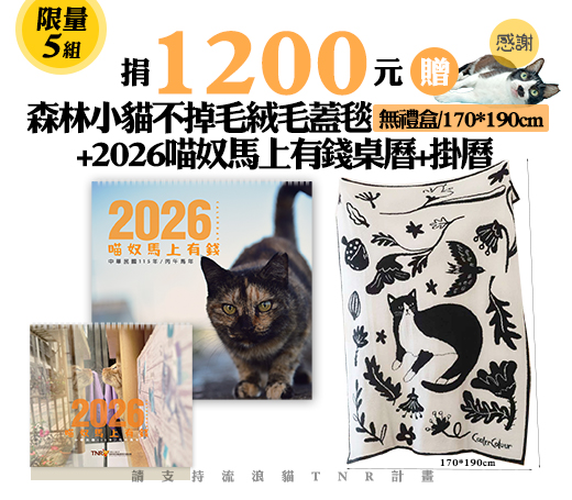 候補人員: 說明: 捐1200元贈森林小貓不掉毛絨毛蓋毯(無禮盒/170*190cm) +2026喵奴馬上有錢桌曆+掛曆