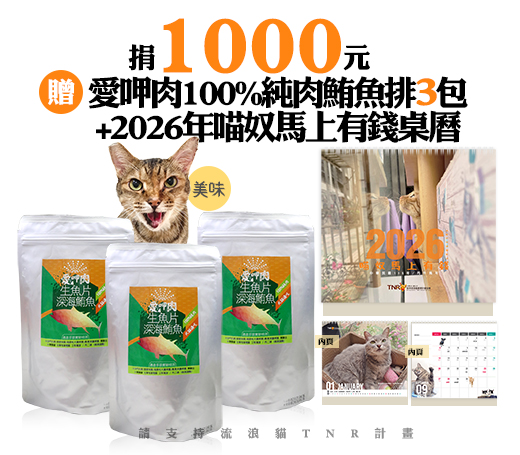 贈品名稱: 捐1000元贈愛呷肉100%純肉鮪魚排3包+2026年喵奴馬上有錢桌曆 贈品總數: 50人 每人捐款金額: 1000元 已報名名額: 0 尚需求名額: 50 報名人員: 候補人員: 說明: 捐1000元贈愛呷肉100%純肉鮪魚排3包+2026年喵奴馬上有錢桌曆