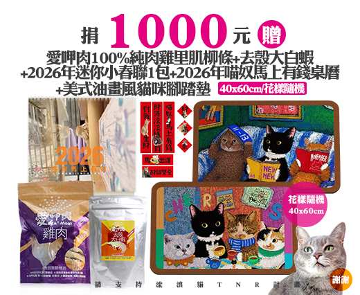 贈品名稱: 捐1000元贈愛呷肉100%純肉雞里肌柳條+去殼大白蝦+2026年迷你小春聯1包+2026年喵奴馬上有錢桌曆+美式油畫風貓咪腳踏墊(40-60cm/花樣隨機) 贈品總數: 20人 每人捐款金額: 1000元 已報名名額: 0 尚需求名額: 20 報名人員: 候補人員: 說明: 捐1000元贈愛呷肉100%純肉雞里肌柳條+去殼大白蝦+2026年迷你小春聯1包+2026年喵奴馬上有錢桌曆+美式油畫風貓咪腳踏墊(40-60cm/花樣隨機)