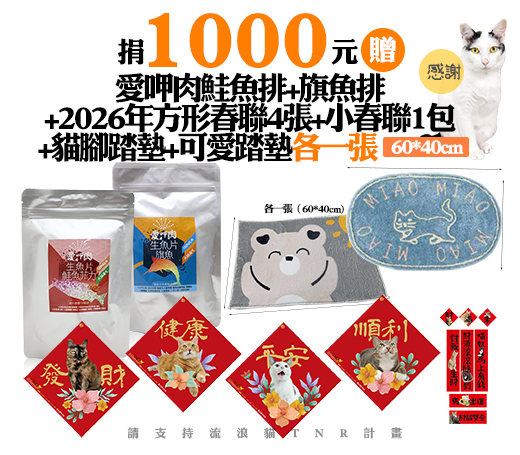 贈品名稱: 捐1000元贈愛呷肉鮭魚排+旗魚排+2026年方形春聯4張+小春聯1包+貓腳踏墊+可愛踏墊各一張(60*40cm) 贈品總數: 20人 每人捐款金額: 1000元 已報名名額: 0 尚需求名額: 20 報名人員: 候補人員: 說明: 捐1000元贈愛呷肉鮭魚排+旗魚排+2026年方形春聯4張+小春聯1包+貓腳踏墊+可愛踏墊各一張(60*40cm)