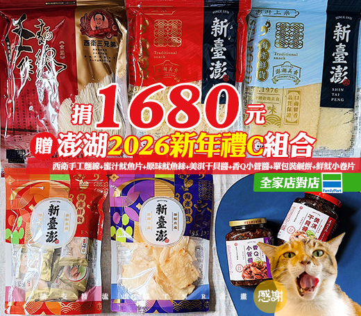贈品名稱: 捐1680元贈澎湖2026新年禮C組合(全家店到店)(西衛手工麵線+蜜汁魷魚片+原味魷魚絲+美淇干貝醬+香Q小管醬+單包裝鹹餅+鮮魷小卷片) 贈品總數: 30人 每人捐款金額: 1680元 已報名名額: 0 尚需求名額: 30 報名人員: 候補人員: 說明: 捐1680元贈澎湖2026新年禮C組合(全家店到店)(西衛手工麵線+蜜汁魷魚片+原味魷魚絲+美淇干貝醬+香Q小管醬+單包裝鹹餅+鮮魷小卷片)