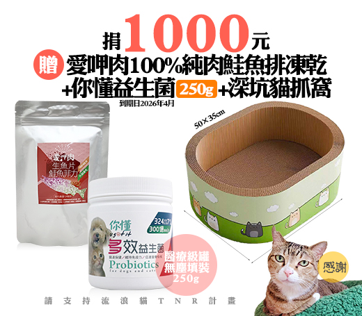 候補人員: 說明: 超好康!捐1000元贈愛呷肉100%純肉鮭魚排凍乾+你懂益生菌(250g/到期日2026年4月)+深坑貓抓窩