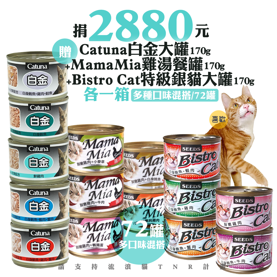 贈品名稱: 捐2880元贈Catuna白金大罐170g+MamaMia雞湯餐罐 170g+Bistro Cat 特級銀貓大罐170g各一箱(多種口味混搭/計72罐) 贈品總數: 50人 每人捐款金額: 2880元 已報名名額: 0 尚需求名額: 50 報名人員: 候補人員: 說明: 捐2880元贈Catuna白金大罐170g+MamaMia雞湯餐罐 170g+Bistro Cat 特級銀貓大罐170g各一箱(多種口味混搭/計72罐)
