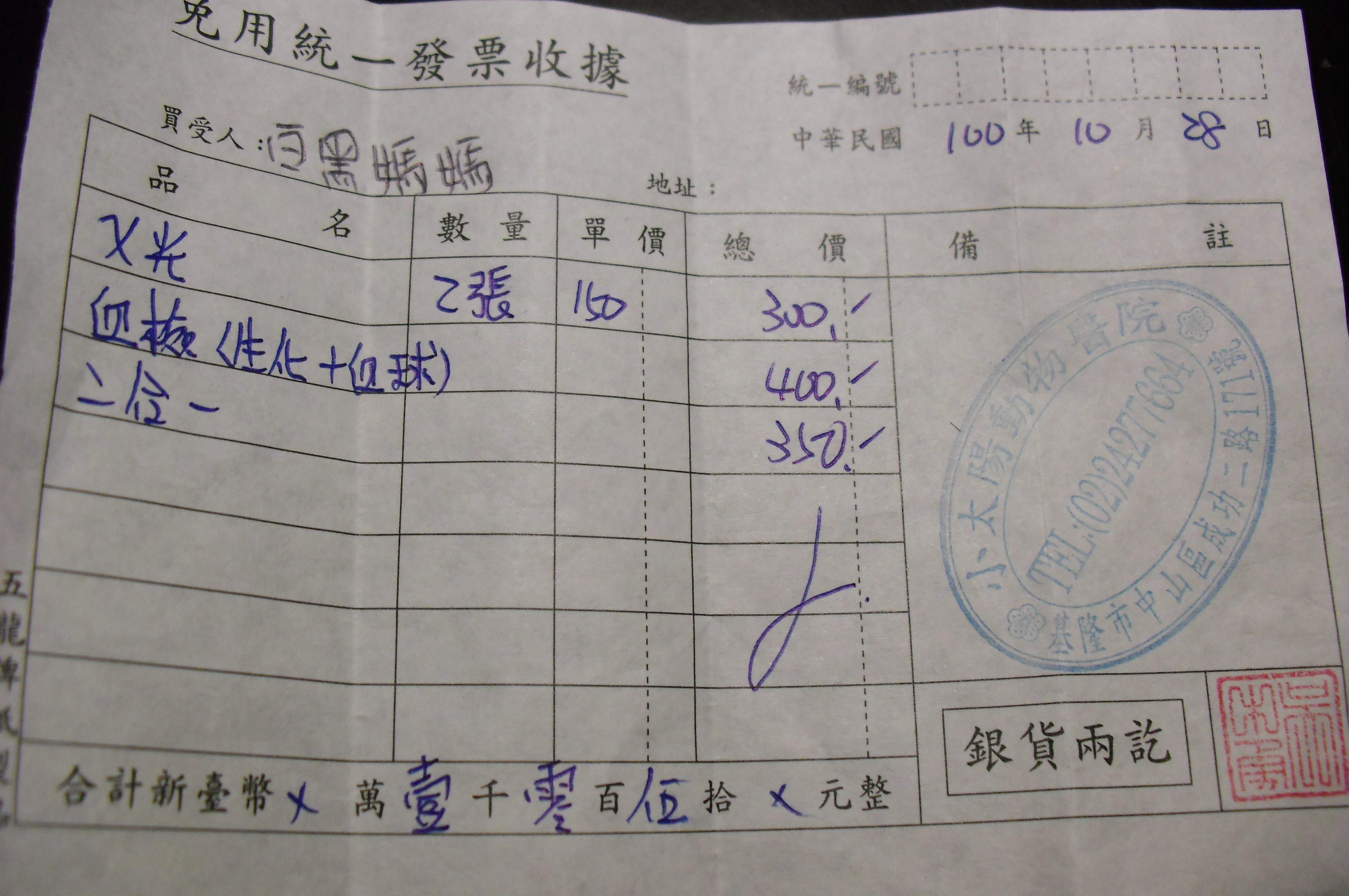 醫藥費共1050元特別說明與誘捕心情: 助紮為0
