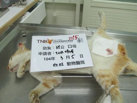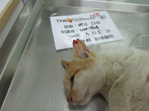誘捕者暱稱: 臺北市支持流浪貓絕育計劃協會 性別: 公 花色: 黃白 誘捕地點: 寺廟 結紮醫院: 欣旺動物醫院 結紮費用: 800 助紮者: 已付款:Feelingx3 額外醫療費用申請: 特別說明與誘捕心情: 經購地庇護中心鄰居通報,
