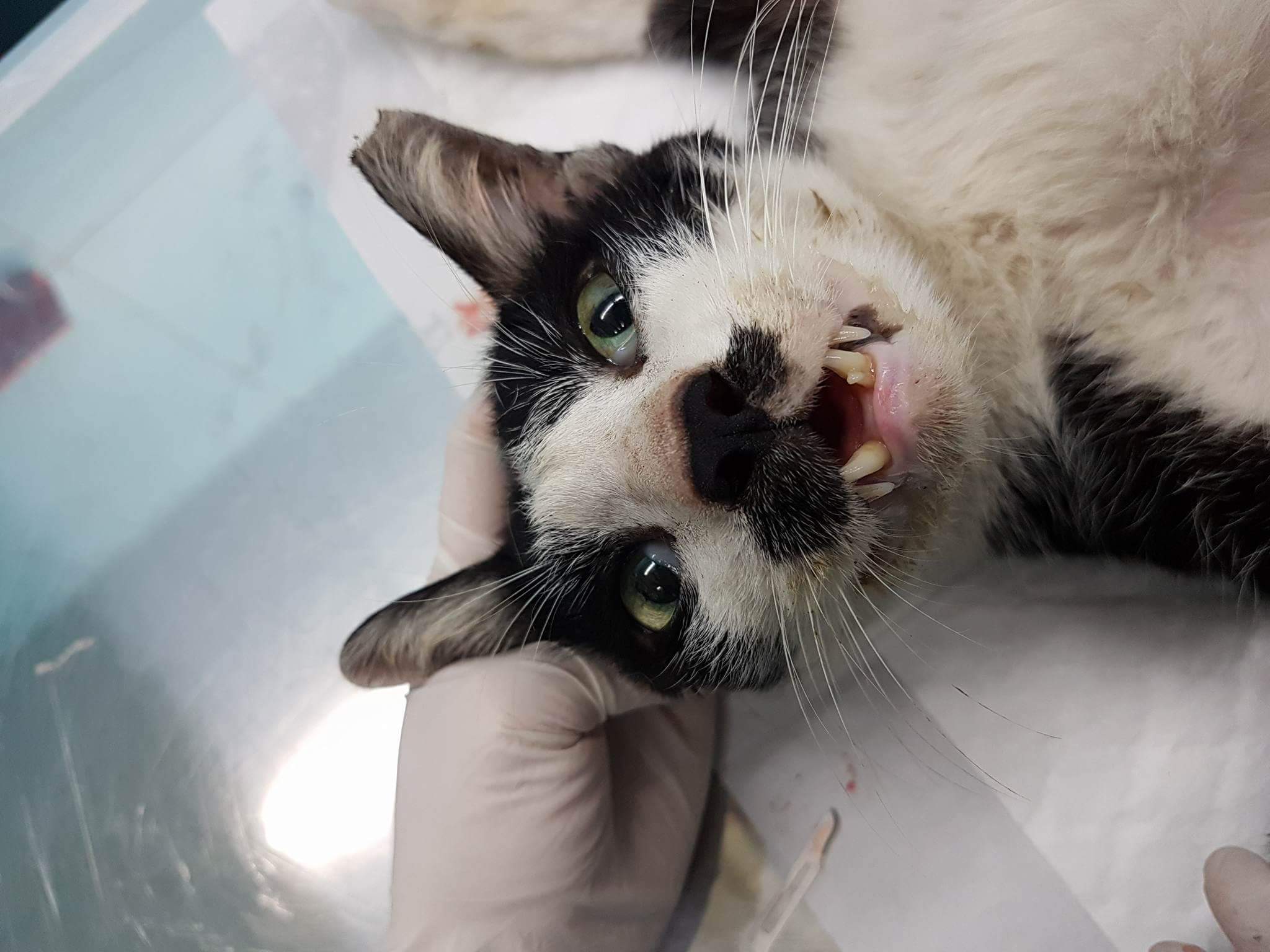誘捕者暱稱: 張馨蓓 性別: 公 花色: 黑白小鬍子 誘捕地點: 桃園市八德區大忠里 結紮醫院: 綠光動物醫院 結紮費用: 800 助紮者: 已付款:黃恰皮x1, 黃阿喵x1, 黃愛莎x1 額外醫療費用申請: 特別說明與誘捕心情: 此貓名為"小鬍子",在大忠里我已餵養他兩三個月,一開始發現他出奇的瘦,且有皮膚病,於是誘捕送醫後,醫生發現他肺部積水嚴重,呼吸困難,所以除了結紮以外,也評估是否開刀做肺葉切除。預計出院後,會找中途暫為安置,小鬍子親人可愛,希望能找到認養人,如仍無人認養,只好原地放回。