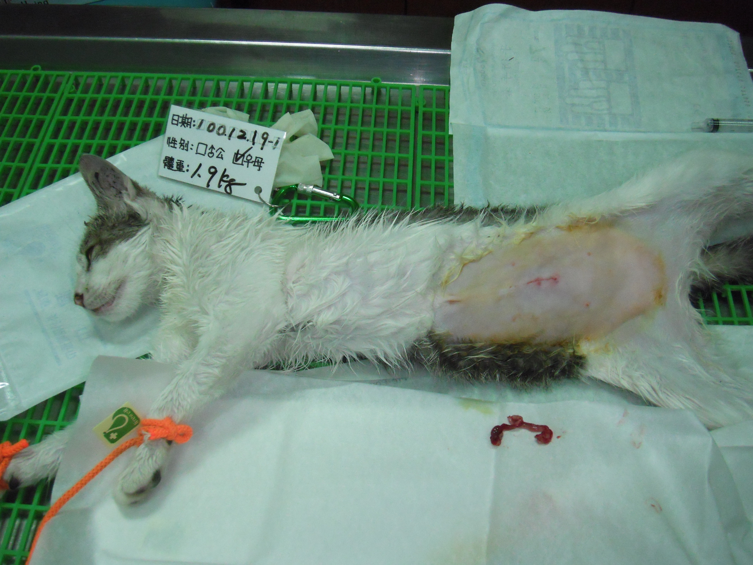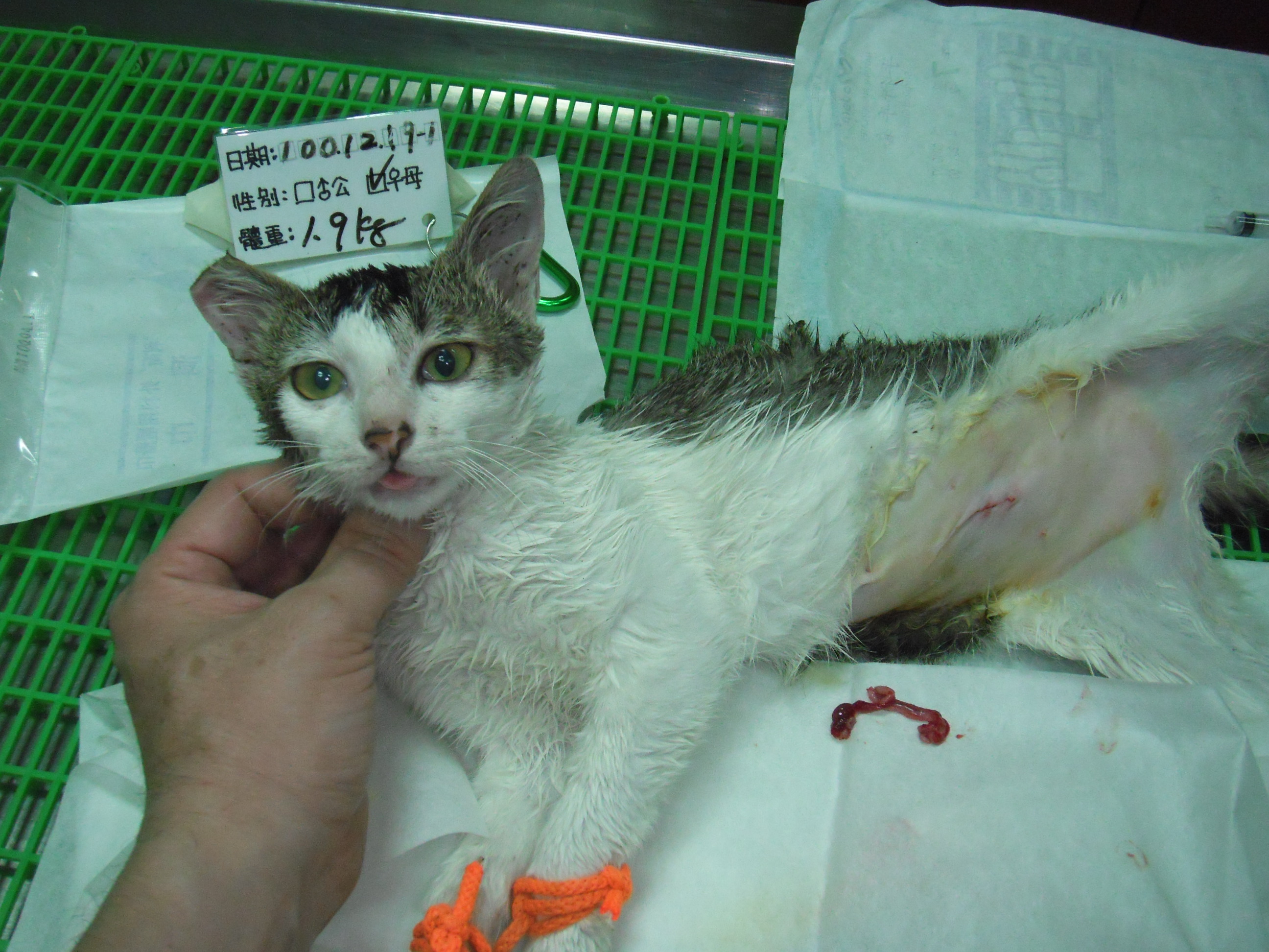 誘捕者暱稱: 周紫彤 性別: 母 花色: 白底虎斑 誘捕地點: 中和區 結紮醫院: 聖博獸醫院 結紮費用: 1200 助紮者: 已付款:Bubu Wang 額外醫療費用申請: 已除跳蚤及體內驅蟲 特別說明與誘捕心情: 編號:100.12.19-01
