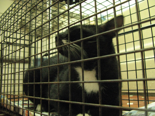 去的時候有幾隻在車子底下,抓到的這隻其實是最近新出現的,我想他是被丟棄的!他長的像我家阿肥(也像板主的咪咪嚕),所以我都叫他小阿肥,抓到以後才發現他真的蠻大隻的,也頗重!在籠子裡也不會哈人,真的是被丟掉的啊, 命很苦 > <