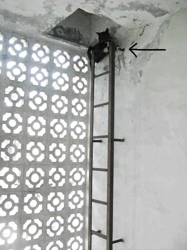 7/23 正要帶小阿肥去醫院,結果提籠在樓梯爆開,小阿肥先爬上洞洞牆,然後就移到梯子的上面,用了潑水招和棍子搓搓招都沒用, 後來他還嚇到尿尿