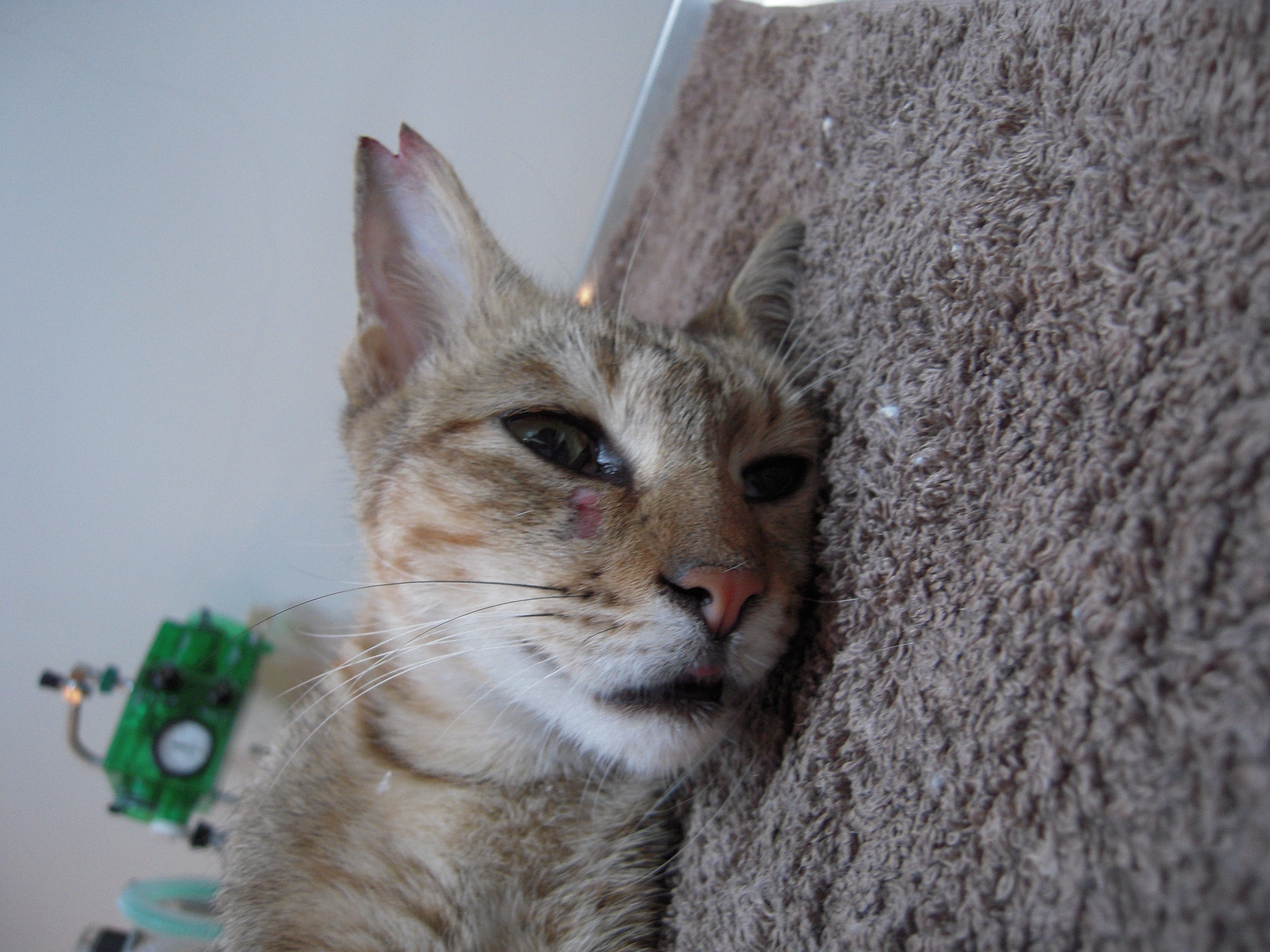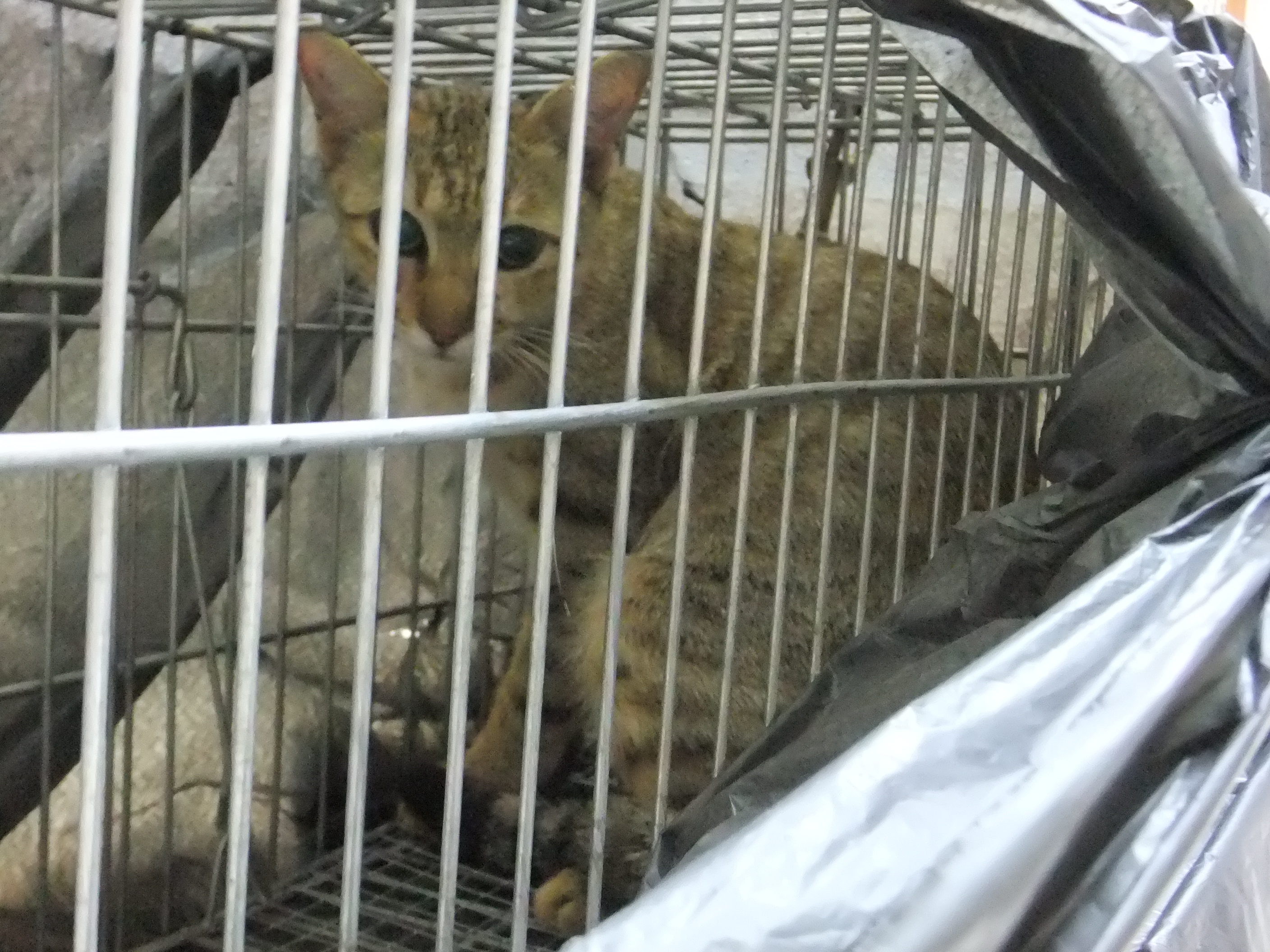 剛好到天亮時, 還有個空籠子, 在一處小空地, 發現這隻肚子已很大的母貓, 與一隻白色公貓在棲息, 於是放下誘捕籠, 沒想到這隻漂亮的貓咪, 很快就進籠了。