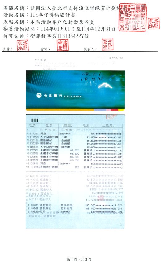 社團法人臺北市支持流浪貓絕育計劃協會 114年守護街貓計畫 公開徵信