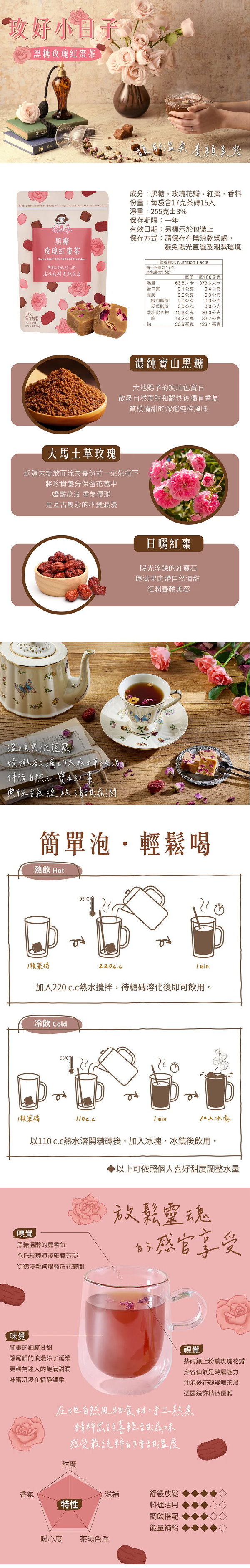 ※ 茶磚外觀色澤易受玫瑰花食材自然的褪色現象而變化,屬正常現象請安心飲用
