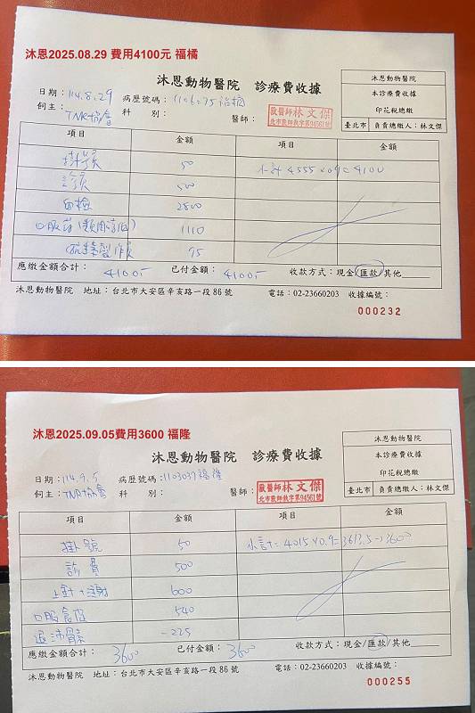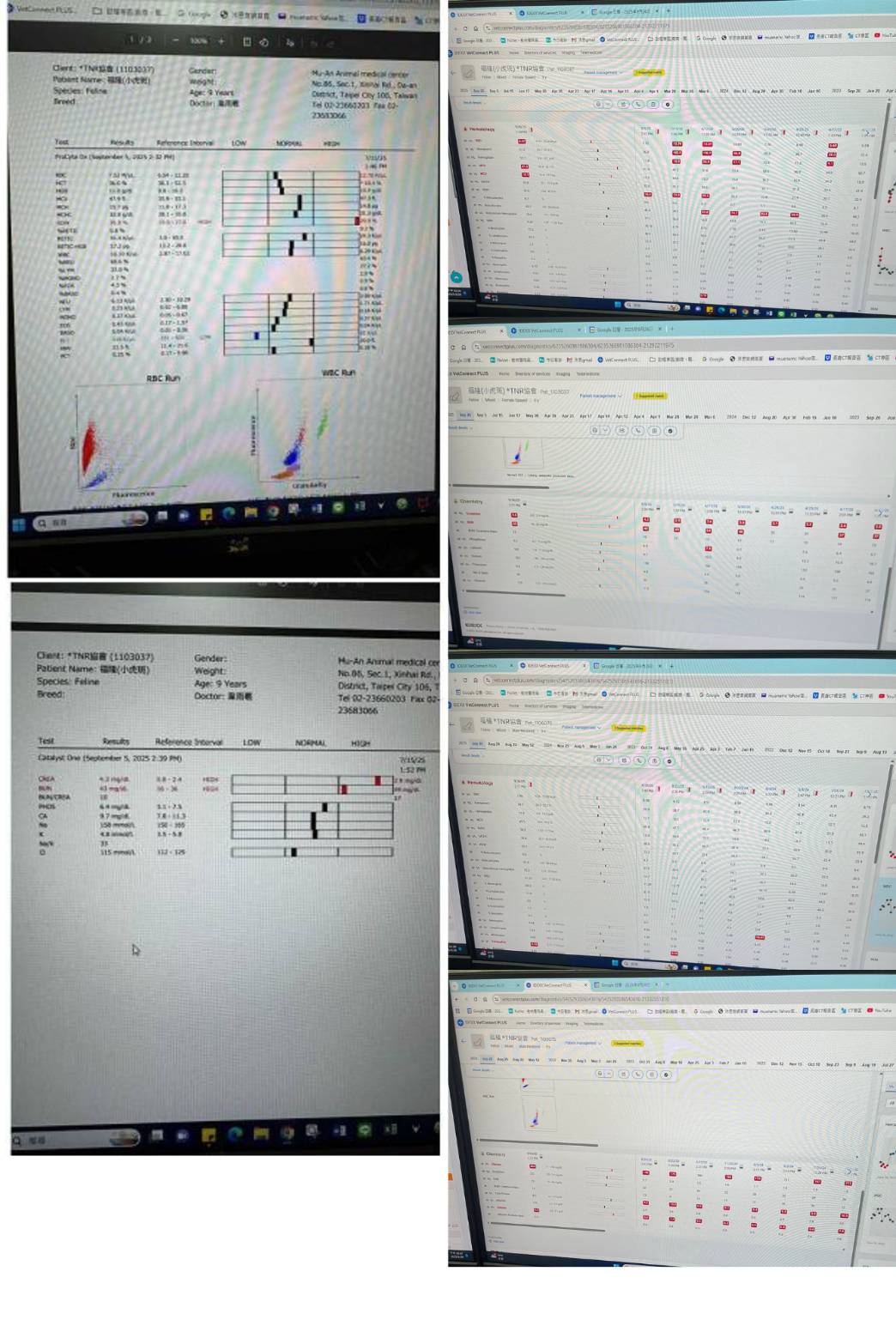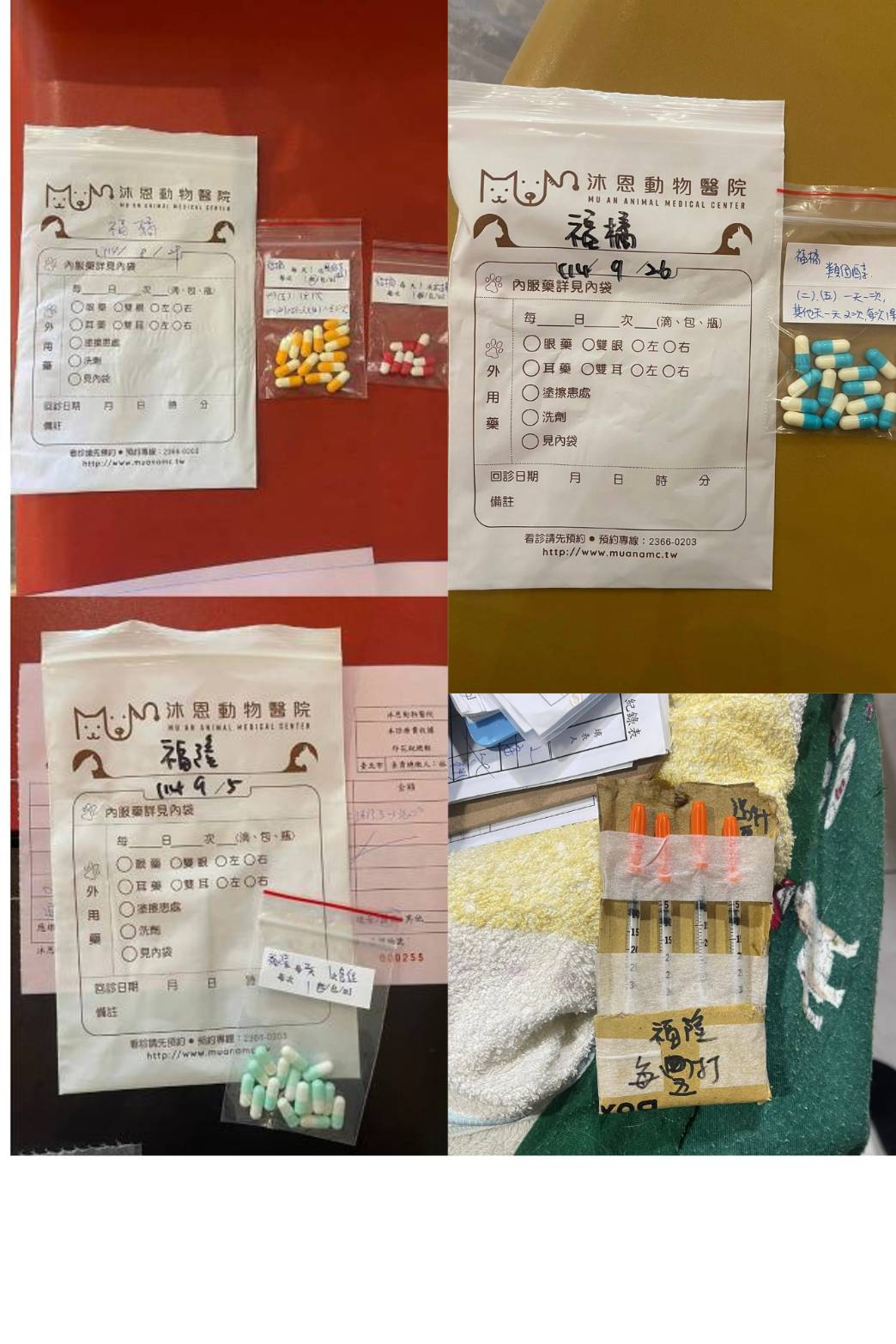 此次於2025年9月5日回診,今進行胜肽治療,然因腎指數飆高無法施打鎮靜劑,故此次沒有進行X光拍攝。近期再於9月26日回診,腎指數還是有點高,但因體重有變重,還在可接受範圍。但紅血球數偏低,需打造血針並持續觀察。本筆醫助是福隆於2025年9月5日至2025年9月26日間於沐恩醫院的醫療費用,包含血檢及用藥。