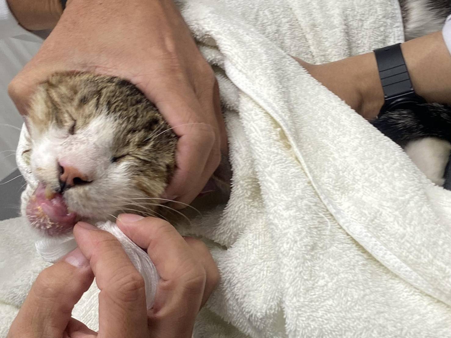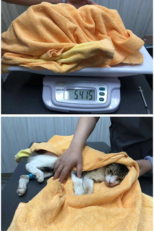 貓咪病情複雜,醫生們懷疑是腫瘤問題,於是7月初寫信向協會尋求幫助,目前已於合作醫院長青進行各項檢測,並於楊動物醫院住院照護中。經檢測,無腫瘤活躍細胞,細菌培養亦無細菌感染,已再進一步另做細菌切片染色檢測。第一階段報告結果,醫師認為,下巴跟頸部後側莫名腫大的原因,跟貓愛滋發病有關。目前投以抗生素、造血針治療中。