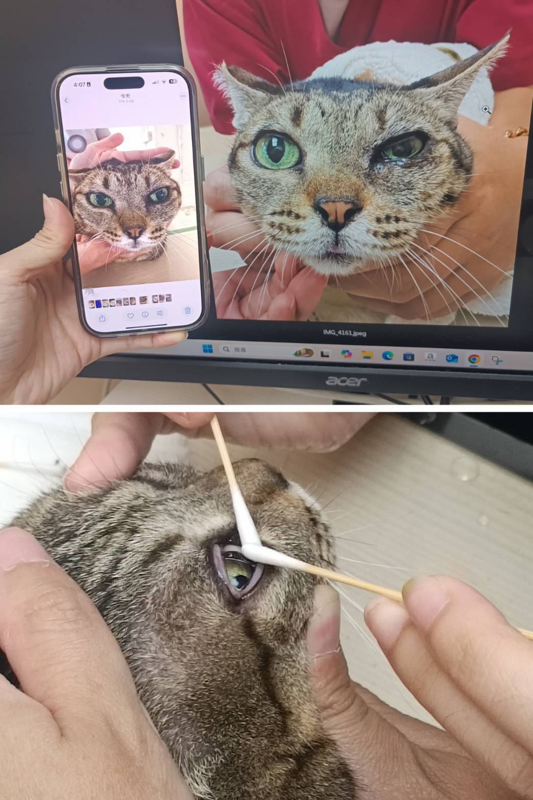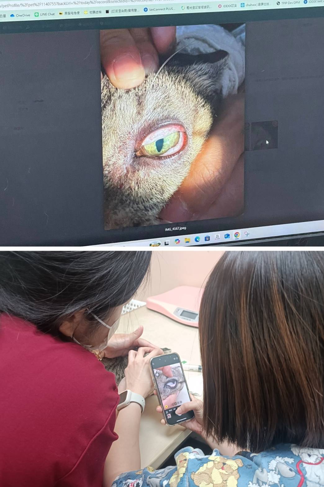 今日採樣及檢查雙眼,左眼與右眼因病毒感染導致結膜水腫。