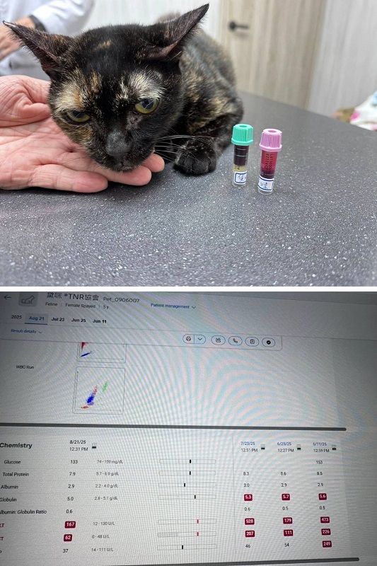 2025年6月11日,黛咪因每週日的固定測量體重逐漸減輕,又眼睛分泌物多、結膜紅及有濃鼻涕,還有右後腳底摸起來有點泡泡,約診木恩醫院檢查,觸診後腳略為泡泡的但沒有發現傷口,血檢結果,發炎指數及肝指數都升高,X光檢查並沒有發現異常,超音波檢查肝臟沒有發現腫瘤影像,但沒有看到膽的影像,而黛咪來到協會後並未做過膽摘除手術,這樣情況除了是膽有纖維化造成與旁邊組織的辨認度變差,或是膽囊曾破裂沒有脹大,因血檢顯示並不像肝臟有急性發炎,所以就先吃抗生素,除了對呼吸道有效果,若肝指數升高是細菌感染引起及腳底泡泡的是發炎都也會有效果,同時也有促進食慾功能,眼睛則點抗生素眼藥水及人工淚液。