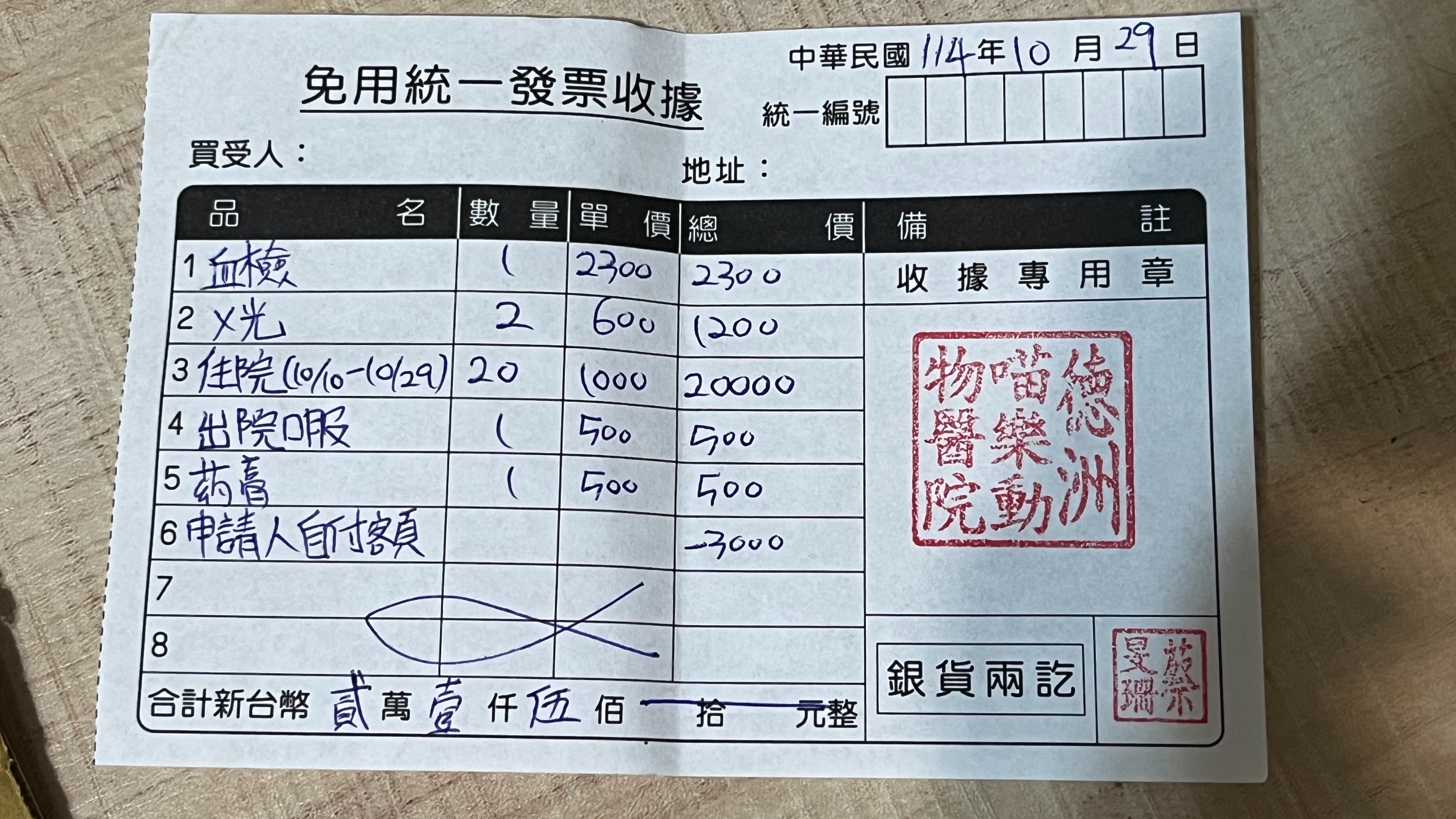 3.住院(每天換藥、抗生素治療、無點滴)1000元/天,10月10號至10月29日共20000元。