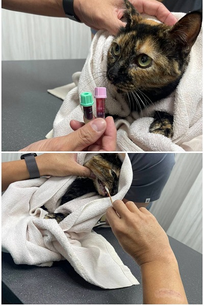 ,且有脫水症狀,在沐恩先打皮下200ml, 腹部超音波無腹水,X光 正常,口腔正常,需先觀察有沒有吐、拉肚子。如可以的話,可帶糞便來檢驗,看有無寄生蟲。後再於同月27號回診, 尿檢後發現腎及肝有發炎,且輸尿管不順,評估可能有潛在病毒或細菌感染,先使用抗生素治療若無嘔吐再餵驅蟲藥。
