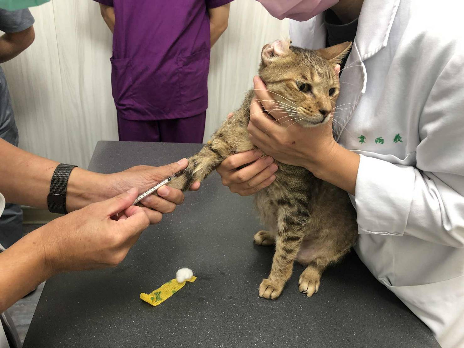 血檢結果愛滋白血二合一為陰性,耳朵因感染酵母菌及耳疥蟲導致耳血腫,還有脫水、貧血、嚴重口炎,又因上呼吸道嚴重感染導致帶血濃鼻涕,因阿灰原本生活地區的貓咪已有數例為愛滋及血巴東,所以再送驗血巴東檢查,幸好收到報告後血巴東是陰性,因此研判貧血原因可能是跳蚤太多及營養不良,住院期間又發現有毛囊蟲,打針及吃藥至狀況穩定做了耳血腫治療的手術,住院近一個月時間、狀況較為穩定,辦理出院接回安養之家,在內科方面治療至較為穩定、為了改善口炎情況,於2022年3月22日進行牙周手術全口拔牙。