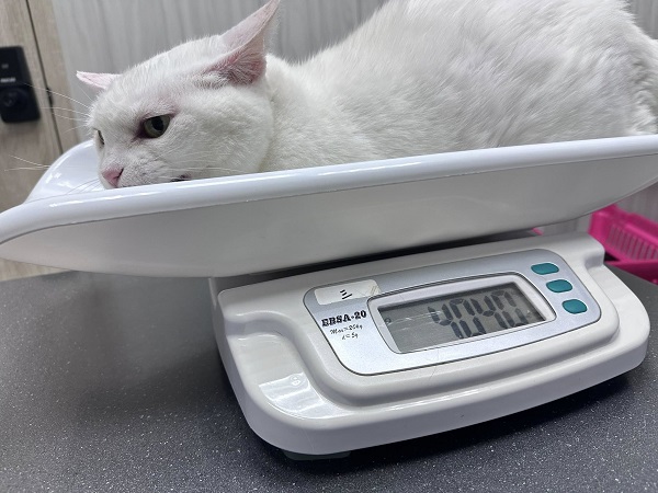 2024年8月回診,腎指數又開始升高,開始打皮下輸液,但兩個月後回診的腎指數還是繼續上升,紅血球指數也下降、血壓稍高,要打造血針與吃血擴藥,為讓小白的健康更穩定,開始給予胜肽治療,至2025年1月回診,血壓已經恢復正常數值、體重回升,腎指數仍高於標準但沒有再上升、紅血球指數回升,口腔狀況良好,整體檢查結果有進步,可以延長回診時間,期間回報及取藥即可。