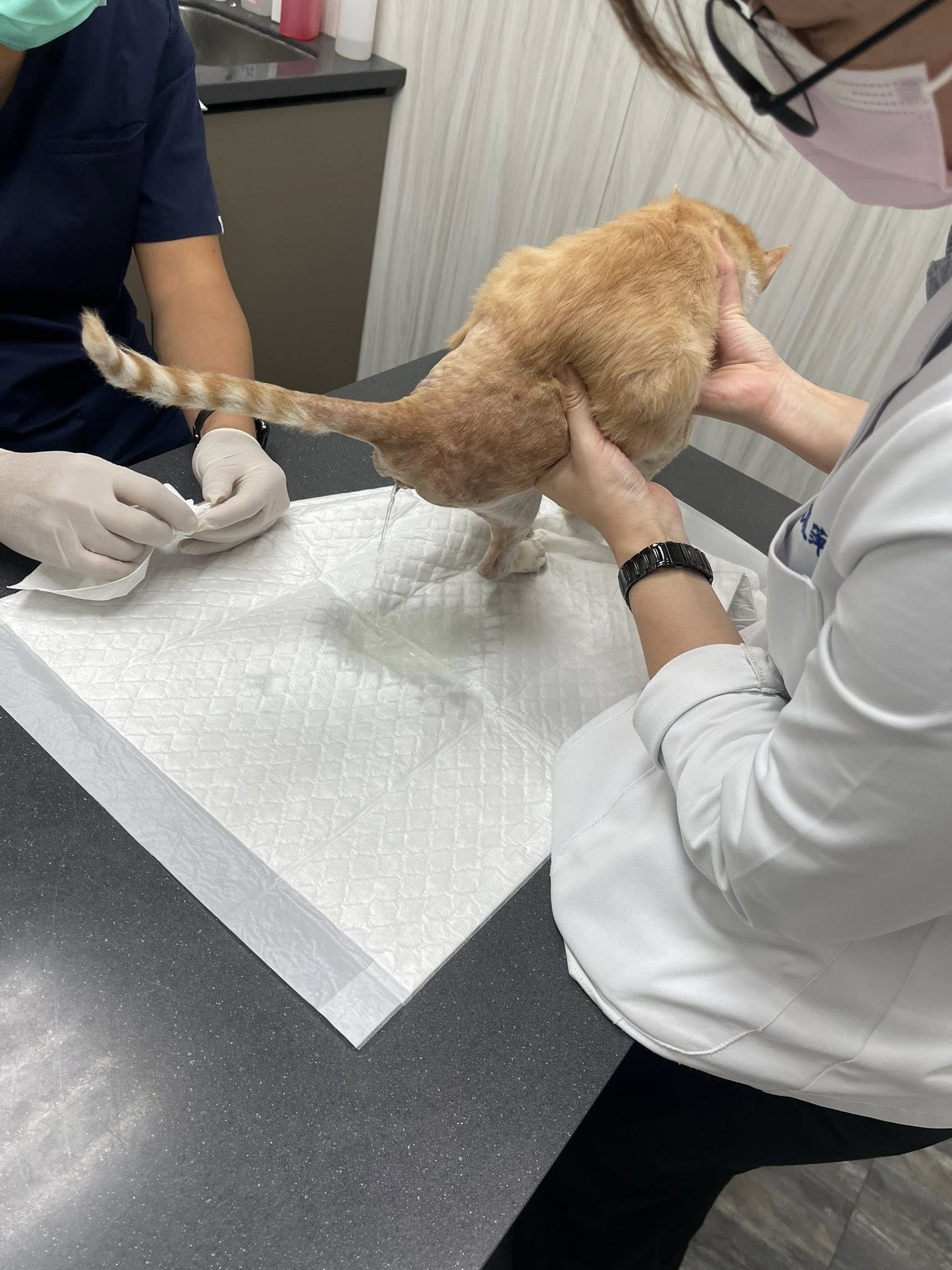 Lucky今早照護員發現有血尿,因此臨時約診。