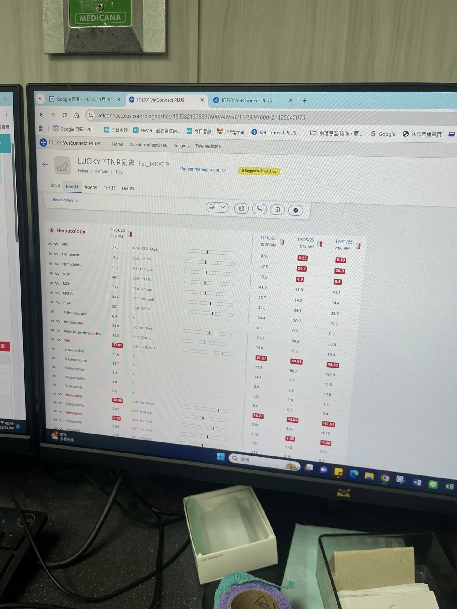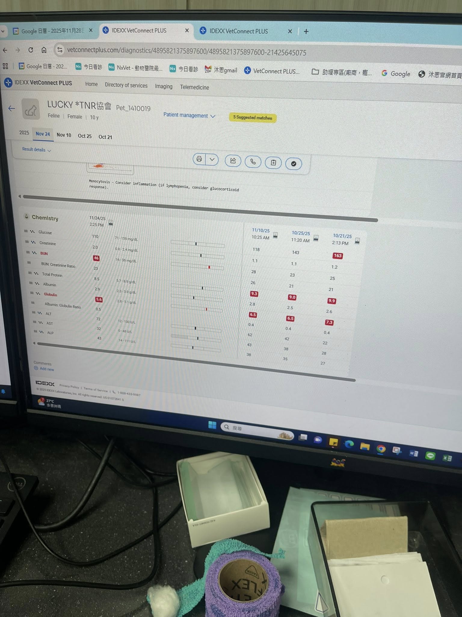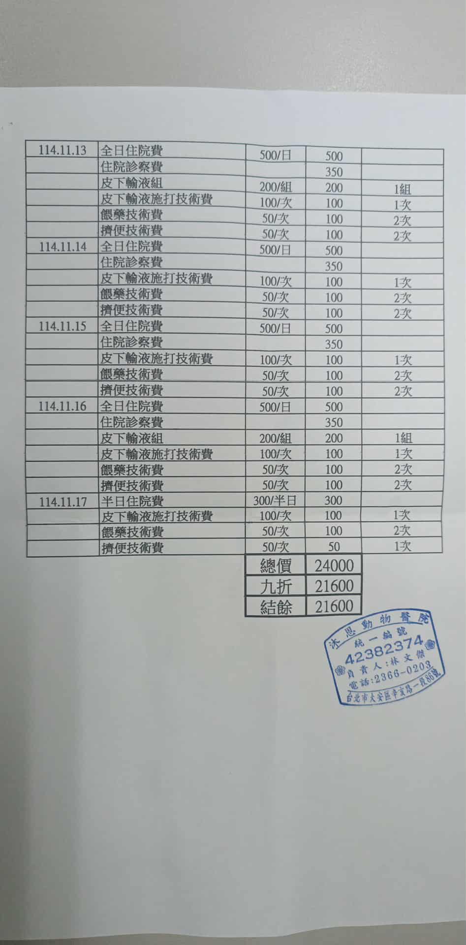 後又於2025年11月24日回診,白血球指數可能跟他肺部之前感染有關係,不大影響。但腎指數有點高,需吃腎處方飼料。目前已會自行翻身但仍注意定時查看避面免過長時間都躺同一側造成褥瘡。本筆醫助為2025年11月6日至2025年11月24日於沐恩醫院的費用,包含回診住院,檢驗,血檢及用藥。