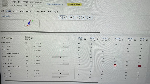 2025年2月11日於沐恩醫院的回診,血檢各項指數都在正常值內,口腔檢查因小金很緊張醫師只能看到幾秒,後方的紅與之前看起來差不多,但依照紀錄,回診前兩週吃飯大叫次數有比較多,可能也因此影響食慾,造成體重減輕一些,2025年3月11日的回診,體重有回升了,口腔情況持平,近期於2025年4月9日回診,體重又稍微降一點,但還好近期吃飯大叫的次數有減少,用藥就維持不變、持續每月的胜肽治療。