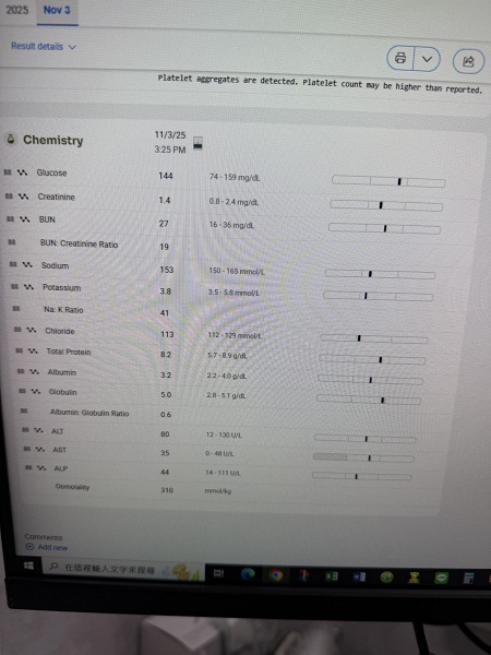 多年的安養照顧小酒窩一直都算健健康康,但在近期2025年11月發現小酒窩多日連續又吐又拉,於是在2025年11月3日安排於沐恩醫院看診,血檢結果指數正常,研判是吃壞食物或腸胃炎,先行早晚餵食胃乳,若腹瀉嚴重持續嚴重再提供半顆止瀉藥。目前小酒窩狀況已好轉。本筆醫助是小酒窩於2025年11月3日在沐恩醫院回診的費用,包含看診血檢及用藥等。