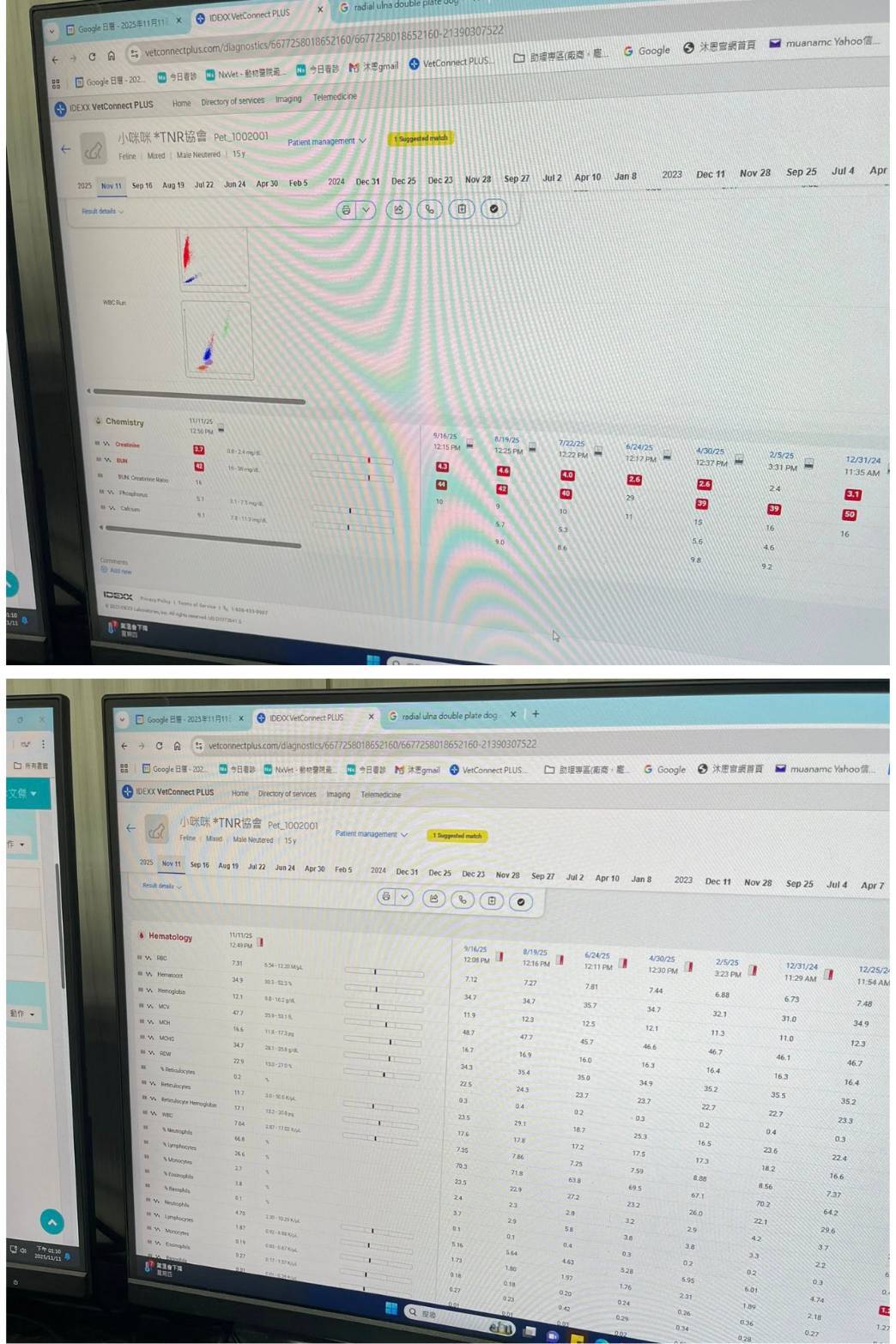 在2024年1月間阿咪因體型明顯變瘦,於2024年1月5日至沐恩醫院檢查,血檢結果腎指數及肝指數都高、有些脫水,口腔檢查發現左上犬齒牙齦腫起一包並有一個小傷口,X光檢查胸腔腹腔沒有明顯異常,整體檢查結果,主要是腎衰及牙周問題,只是在脫水及腎臟問題未處理好之前,不宜接受麻醉手術,所以先打皮下輸液、吃食促,二週後回診紅血球指數下降及磷上升指數,增加打造血針及吃降磷藥,治療至內科狀況較為穩定後,於2024年3月19日進行牙周手術,因腎指數仍是較高、麻醉手術不宜過長時間,所以手術只拔除狀況較差的四顆牙齒,完成牙周手術後仍持續回診治療肝腎指數問題,為了幫助阿咪的健康能更穩定,也開始做胜肽治療。