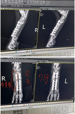 近一次回診是2025年6月17日,包紮拆除後剃毛刷洗,X光影像顯示骨頭沒有位移,觸診骨板也很牢固,但骨頭長得速度很慢,研判可能是因為愛滋白血帶原影響到骨頭生長,本來打算等骨頭長好再完全拆除包紮,但以這次狀況看起來可能等不到,所以這次就不包紮,但須完全限制行動