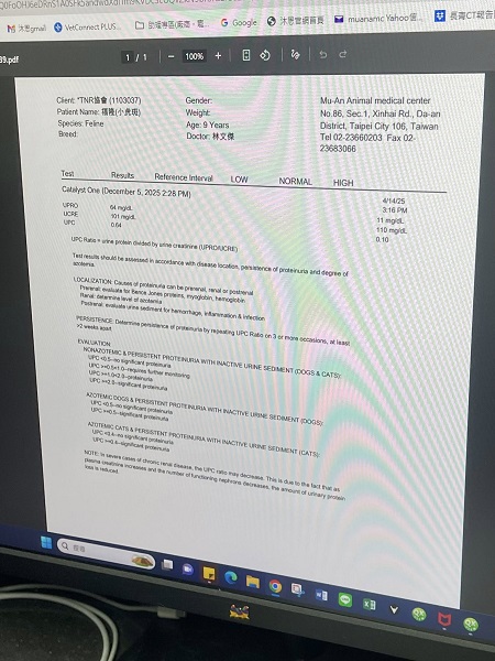 此次於2025年9月5日回診,今進行胜肽治療,然因腎指數飆高無法施打鎮靜劑,故此次沒有進行X光拍攝。近期再於9月26日回診,腎指數還是有點高,但因體重有變重,還在可接受範圍。但紅血球數偏低,需打造血針並持續觀察。後於2025年10月27日回診,腎指數依然超出指數需持續用藥。