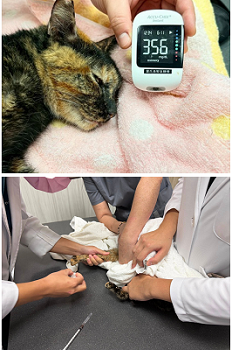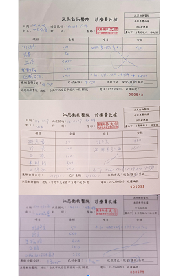 ,且有脫水症狀,在沐恩先打皮下200ml, 腹部超音波無腹水,X光 正常,口腔正常,需先觀察有沒有吐、拉肚子。如可以的話,可帶糞便來檢驗,看有無寄生蟲。後再於同月27號回診, 尿檢後發現腎及肝有發炎,且輸尿管不順,評估可能有潛在病毒或細菌感染,先使用抗生素治療若無嘔吐再餵驅蟲藥。