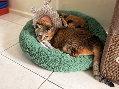近期11月因仁愛出現黃鼻涕狀況,因此提前於2025年11月25日沐恩回診,血檢發現有些貧血但還無須施打造血針,先吃倍補血,但此次發現血液中有很多油脂擔心回有糖尿病症狀,建議先減量灌食的飼料泥。淋巴結有稍微變大但還在可預期範圍內,皮膚黴菌狀況也有好轉可持續保持清潔。