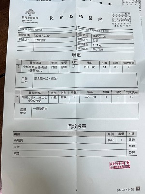 2025年11月25日回診,此次體重增加突然變胖太多,醫師擔心有糖尿病徵兆,但上回有驗過果糖胺是正常,所以這次沒有驗,下次回診如果體重上升會再評估加驗。有與醫師討論,仁愛這幾週食慾並沒有特別變很好,但還是會自己主動吃,因此建議先從照護員灌食飼料泥減量開始。有稍微貧血但還不需要打造血針先吃倍補血保養。淋巴結有稍微變大,但在預期範圍。黴菌患處也好很多。