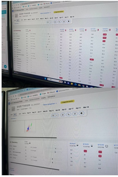 近期2025年8月12日因連續多日嘔吐及食慾不振安排回診,因擔心是胰臟炎安排超音波診斷,所幸未發現特殊狀況,唯有指數上升,研判是嘔吐造成,因此再加開胃乳,並持續觀察回報醫院。一個禮拜後8/19再度回診查看腎指數已有下降,需持續觀察食慾及嘔吐狀況。