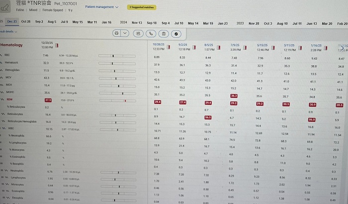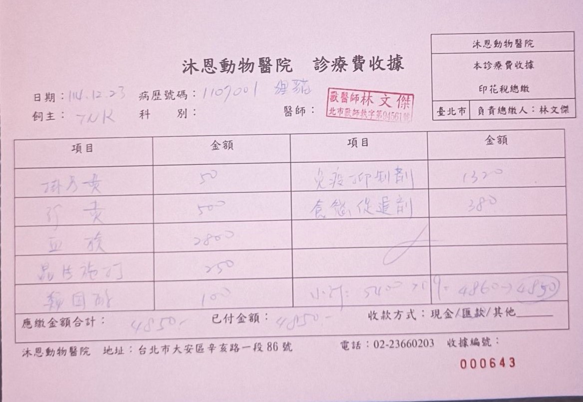 協會多年來持續的至各地進行TNR,遇到許多像狸貓這樣傷病貓咪,經過緊急就醫後因仍需持續醫療或其他因素無法放回原地,就在協會安養照護到終老,這些貓咪的醫療費用往往很龐大,狸貓的口炎及自體免疫問題、肝炎都還須持續回診追蹤及用藥,本筆醫助是2025年12月23日於沐恩醫院的費用,包含回診檢查、血檢、用藥等等。