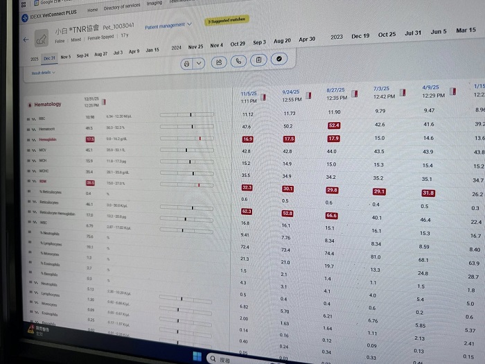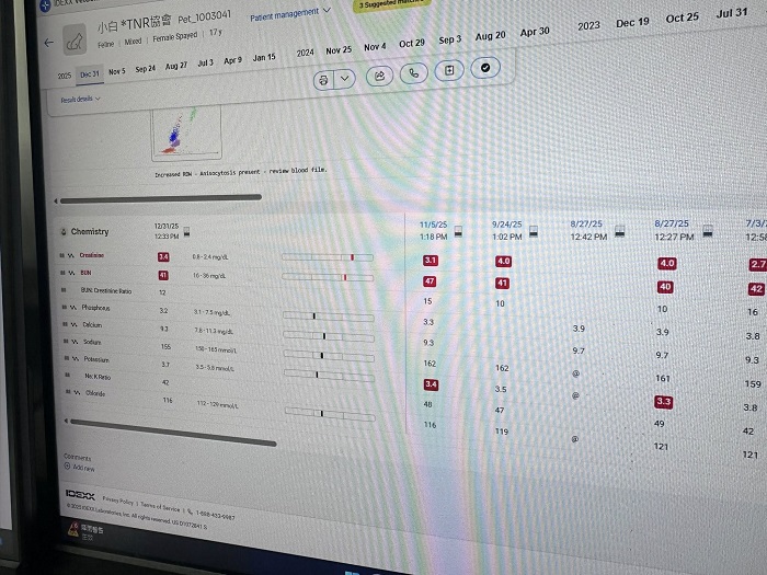 2024年8月回診,腎指數又開始升高,開始打皮下輸液,但兩個月後回診的腎指數還是繼續上升,紅血球指數也下降、血壓稍高,要打造血針與吃血擴藥,為讓小白的健康更穩定,開始給予胜肽治療,至2025年1月回診,血壓已經恢復正常數值、體重回升,腎指數仍高於標準但沒有再上升、紅血球指數回升,口腔狀況良好,整體檢查結果有進步,可以延長回診時間,期間回報及取藥即可。