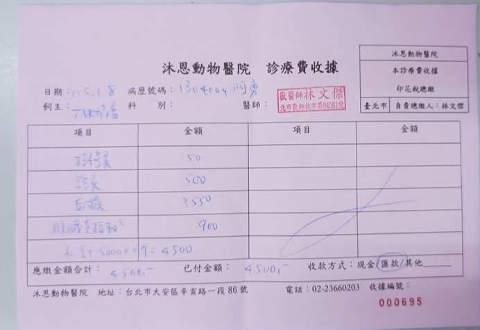 同時考量到阿勇年紀大又沒牙齒,建議多吃濕食,飼料少吃。目前阿勇已逐漸恢復,不再嘔吐,食慾精神也漸入佳境。本筆醫助是2026年1月8日於沐恩醫院的費用,包含看診、血檢及用藥。