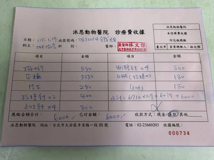 2026年1月發現鐵雄因食慾不振,且腹瀉及吐血絲口水,因此安排2026年1月19日於沐恩醫院看診,血檢顯示白血球指數雖還在正常範圍內,但降低許多,需持續觀察,其他指數則無異常。在醫院先施打林格液、抗生素針與止吐針,並開立藥物回協會持續用藥並灌食。現鐵雄已逐漸恢復食慾可自主進食。本筆醫助是2026年1月19日於沐恩醫院的費用,包含看診血檢及用藥。