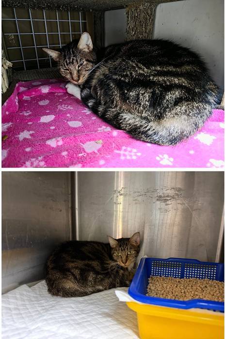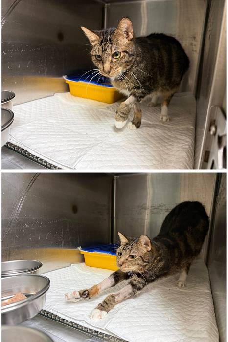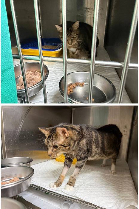 2025年6月8日,六六轉至沐恩動物醫院持續治療,做X光、超音波檢查、住氧氣室吸氧、打靜脈注射,第一天身上有很多跳蚤,噴除蚤藥,之後幾天也投藥驅除體內寄生蟲,六六因頭部受創、意識不清,無法自己進食,所以裝食道胃管也每天都要做血壓監測、打皮下輸液,在X光檢查還發現,六六懷孕了,肚子裡有5-6隻的小寶寶,這讓人很擔心緊張,六六本身狀況還相當不穩定,能否安然度過孕期或順利生產都是未知數,就先以穩定六六的情況為主,還好隨著用藥醫療,六六漸漸的會搖搖晃晃的走路、走走停停,2025年6月15日已不用再住氧氣室、可移到一般病房,用藥也增加了補血針劑,2025年6月21日的X光檢查可見有5個小寶寶團,還好六六已經開始會自己吃較軟的食物,不用全天灌食,也能自己到貓砂盆,只是消化道狀況還不夠穩定,再多觀察幾日,希望可以順利出院照護。 原本2025年6月底已能自己部份進食,也能使用貓砂,醫師認為狀況有改善可以出院,但六六嘔吐兩次,表示消化道仍不夠穩定,因此再留院幾日觀察。