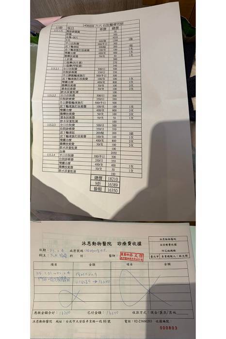 2026年一月因照護員發現六六精神不佳且食慾不振,並有嘔吐狀況,因此安排於2026年1月18日沐恩醫院看診,看診發現六六發燒於是安排當下住院觀察,經幾天觀察後六六已無大礙於1月21日出院,現已回到安養之家接受照護。後於2026年1月31日因持續發現六六精神不振還是未主動進食,因次再次住院觀察,醫師表示六六飲食需要固定且單純避免一直變換,住院三天後已在2月2日可以自主吃完飼料,後安排2月4日出院回協會照護。本筆醫助是六六自2026年1月31日至2026年2月4日間於沐恩醫院的費用,包含住院、監測、回診檢查及用藥等等。