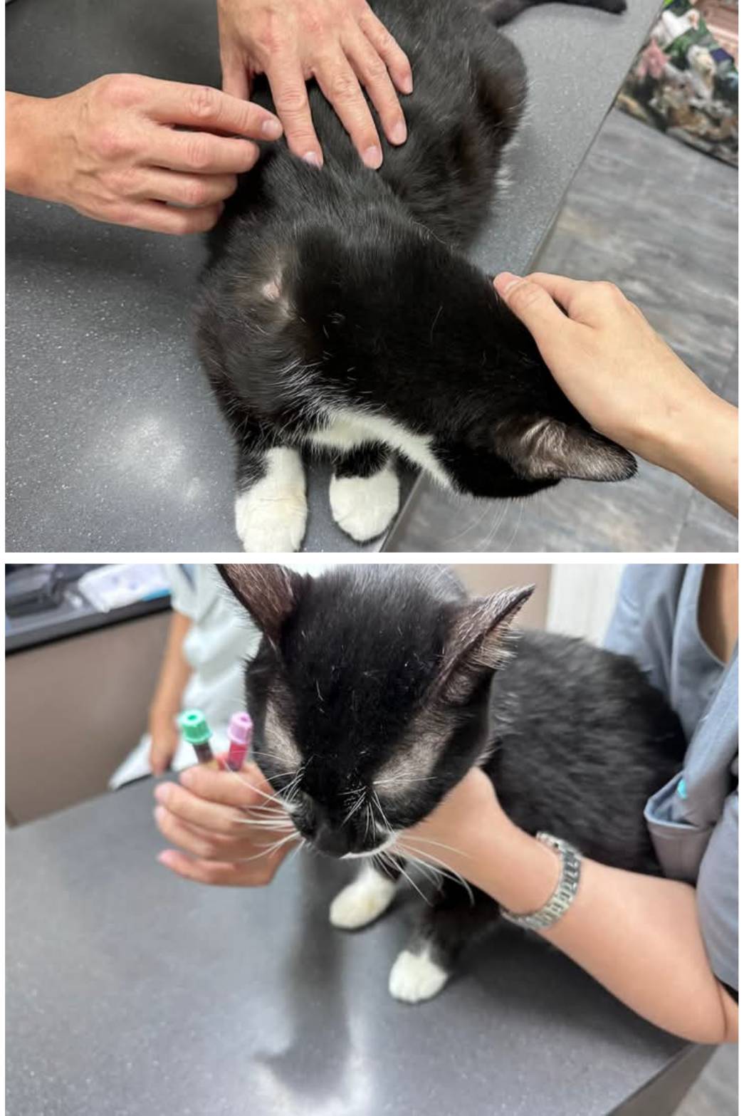 2025年3月6日因照護員摸到周全身上有幾個很小的瘤,至沐恩檢查結果,因其中三個瘤太小無法採樣,只有左腋下靠近胸口的瘤較大一些,採樣後顯微鏡下有看到活躍的細胞但數量太少,這樣無法準確判斷,醫師表示因摸起來有點硬,有可能的是三種情況,1.皮膚型淋巴癌,比較沒那麼惡性,通常切除就好。2.肥大細胞瘤。3.良性腫瘤。就先再觀察一個月,