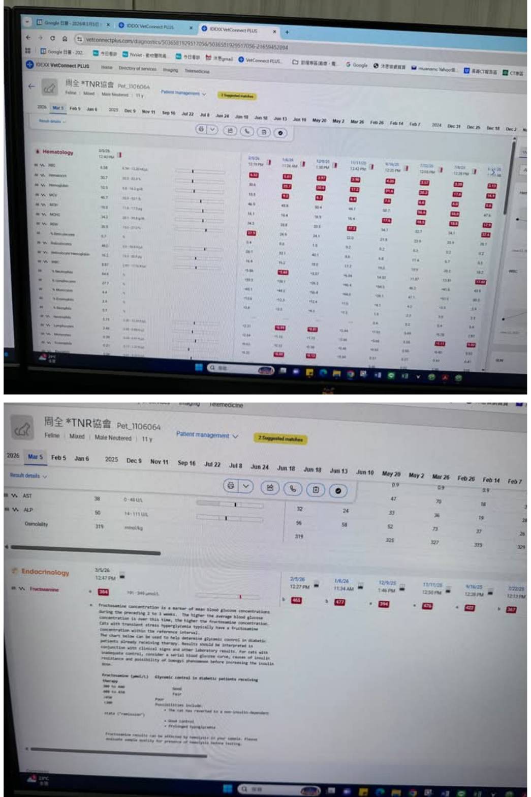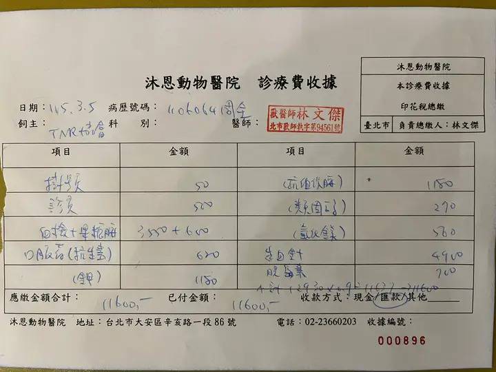 2026年3月5日於沐恩回診,這次血檢結果整體指數還不錯,血糖指數有下降紅血球也持平,因此可拉長至8周後再回診,這次檢查右側頸部部位的禿毛,醫師表示可能是細菌感染,與之前的肥大細胞瘤無關。盡量保持乾淨乾燥。本筆醫助為2026年3月5日於沐恩醫院的費用,包含血檢、血糖監控、X光片及各項用藥。