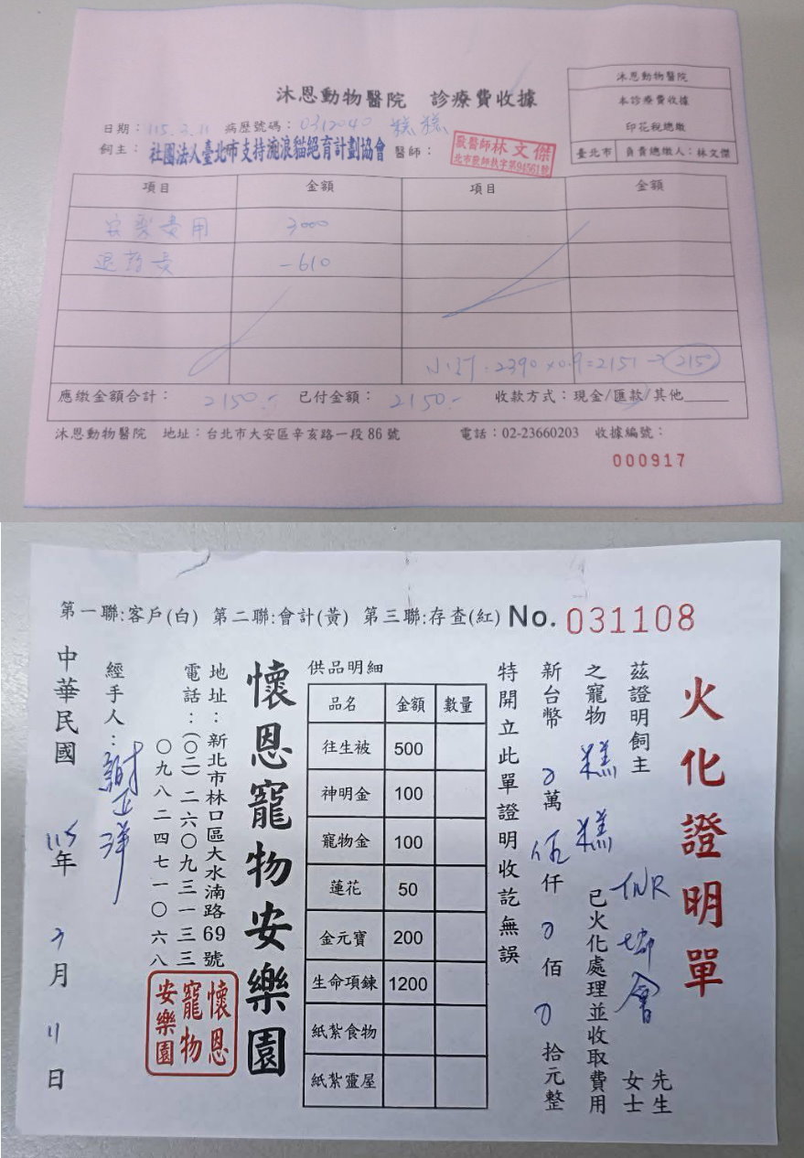 但就在3月11日一早照護員發現糕糕發出類似打嗝聲音,因此先給予吸氧並直接安排於沐恩回診,在醫院時發現是肺水腫造成呼吸困難,不忍糕糕這麼痛苦因此最後決定陪伴他走過最後一程,也祝福糕糕終於離苦得樂。本筆醫助是2026年3月5日至2026年3月9日間於沐恩醫院的費用,包含看診、血檢及用藥。及最後一筆2026年3月11日於懷恩寵物安樂園的火化費用。