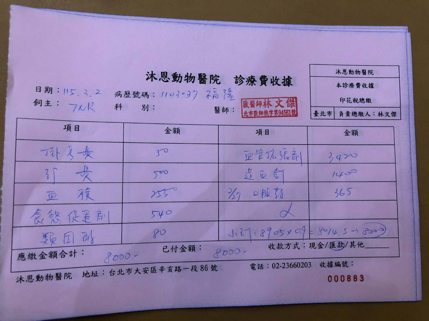 2026年3月2日於沐恩回診,血檢結果腎指數超標,其他暫無須特別留意的超標數值。為了使腎利磷更能配合吃飯,將飼料改為早晚班各放15g。本筆醫助是福隆2026年3月2日於沐恩醫院的醫療費用,包含看診血檢及用藥。