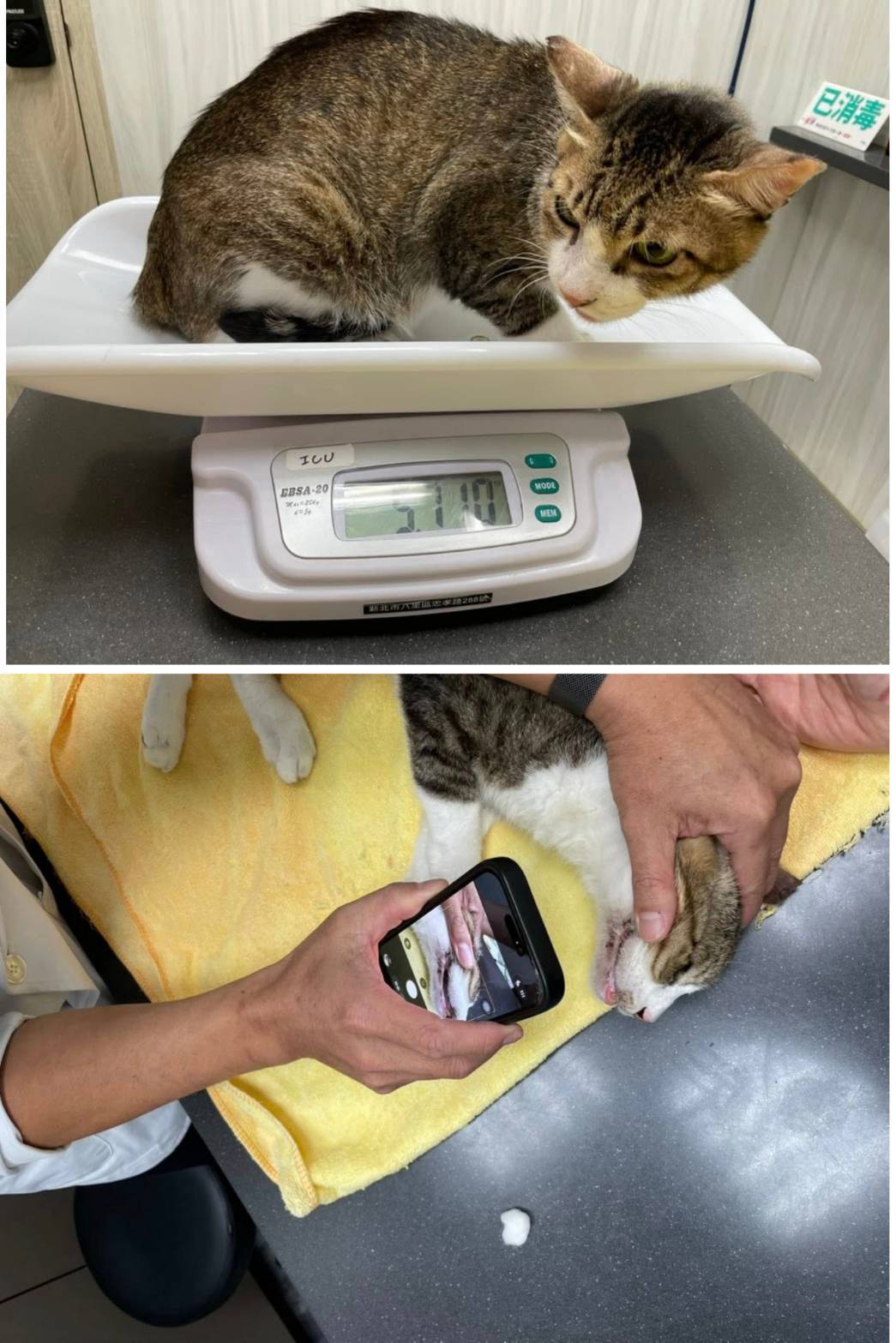 貓咪病情複雜,醫生們懷疑是腫瘤問題,於是7月初寫信向協會尋求幫助,目前已於合作醫院長青進行各項檢測,並於楊動物醫院住院照護中。經檢測,無腫瘤活躍細胞,細菌培養亦無細菌感染,已再進一步另做細菌切片染色檢測。第一階段報告結果,醫師認為,下巴跟頸部後側莫名腫大的原因,跟貓愛滋發病有關。目前投以抗生素、造血針治療中。