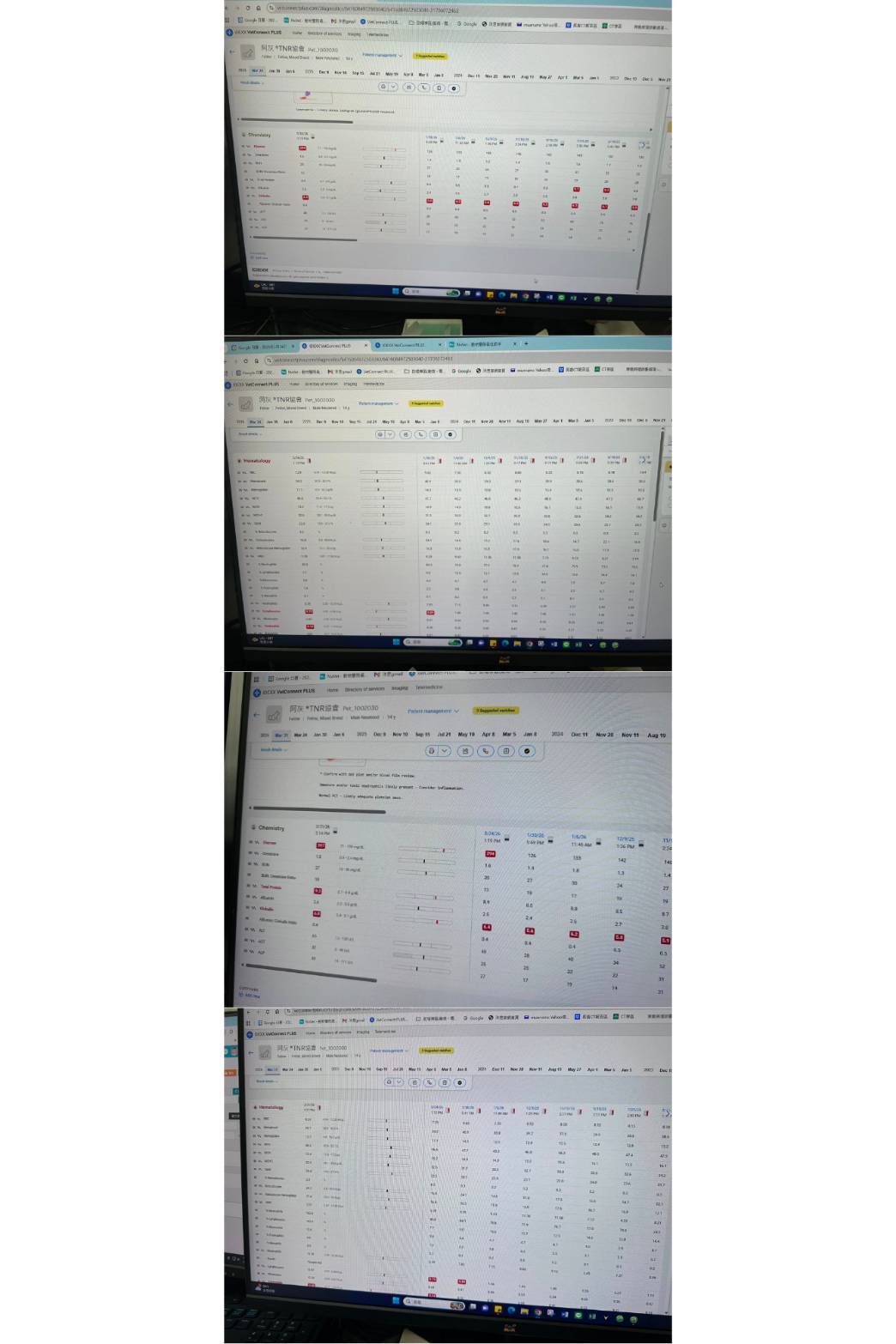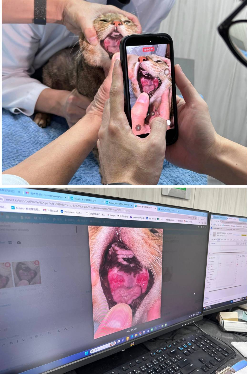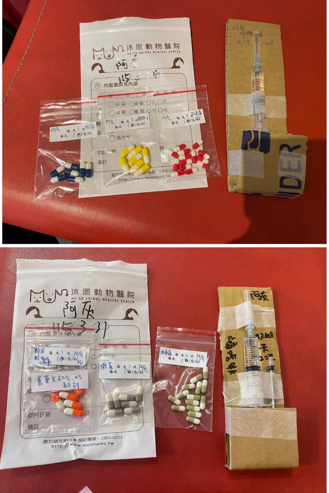 2026年1月6日於沐恩回診,血檢部分免疫球蛋白偏高其他指數則在正常範圍內。此次口腔發炎部分有明顯消腫可於兩個月後再回診查看,但若流口水有便嚴重的話則需提前回診。原先吃的止癢藥因皮膚狀況也變好可先減量。後因阿灰一直嘔吐及流口水撥嘴巴動作提早於1月27日回診看診,林醫師建議先一個月一次高劑量干擾素施打,直到1月30日依然連續嘔吐不止因此住院觀察,直到31日監測結果無大礙於31日出院。醫師表示食物方面可任食,但種類盡量單純,會吃就先不變換食物。