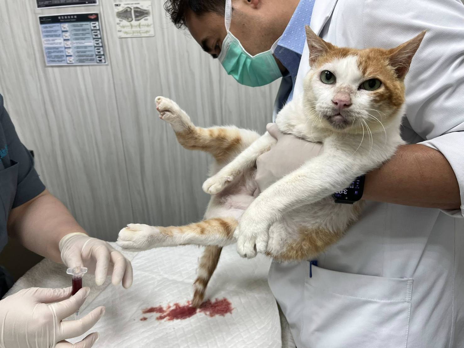 後於2026年2月16日過年期間,因Lucky血尿不止因此緊急於大安動物醫院急診,醫生表示因為外力的因素,也可能因為感染而造成但因為過年期間尿液無法送檢,血檢結果白血球較高,可能是體內的發炎反應,血壓正常、體溫過低需要注意保溫,呼吸較喘,吸氧會比較舒服。加開抗生素跟嗎啡滴劑。超音波顯示膀胱並不會很大,如果自己排尿有很多的話,還是維持原先傍晚跟晚上擠尿即可、或是更少不需特別擠。