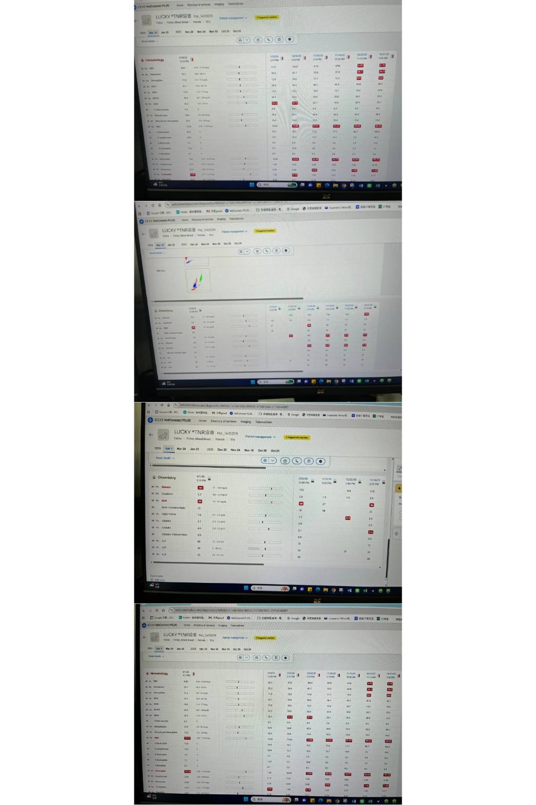 2025年12月22日回診,Lucky體重上升較多,醫師建議可將食物稍微減量以減輕Lucky前腳負擔。此次X光發現肺部有慢性發炎,肺功能不好須注意呼吸次數。後再於12月29日回診,觸診與外觀檢查,口腔檢查發現有牙周病、齒吸收,以及舌頭右下側有團塊,可能是導致吃不好的原因,嘴巴痛的問題先開立止痛藥,要評估是否安排手術。尿檢發現尿內有細菌顆粒,但量不多,可再持續觀察。